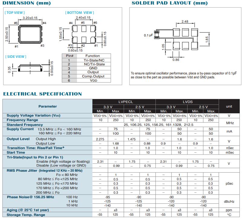 特征: 尺寸3.2x2.5x0.9mm封装,非常低的抖动性能:从12kHz到20 MHz,典型的0.1pSRMS。 基本/第三泛音晶体设计,输出频率高达250 MHz,三态启用/禁用最高125℃工作温度范围。 应用:10Gbit以太网,光纤通道,存储区域网络,SONET企业服务器,ADC和DAC的参考时钟,电信