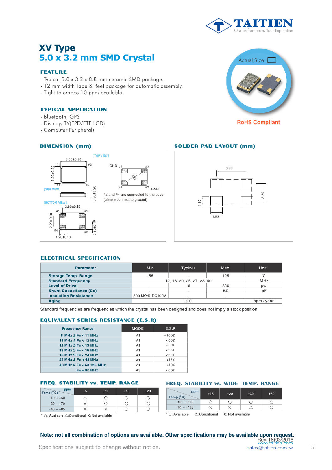 XVHCELNANF-25MHZ 25MHz晶振 5032晶振 20PF 20PPM 泰艺晶振 -40℃ ~+85℃